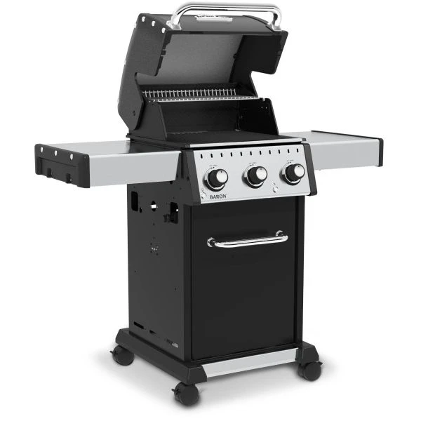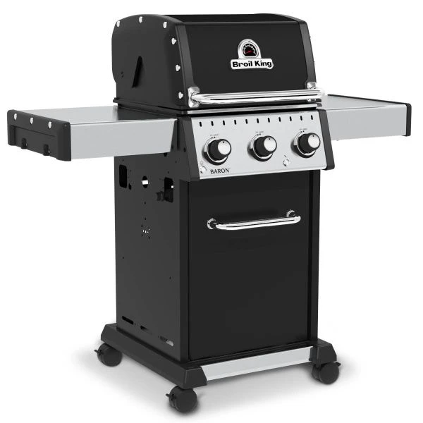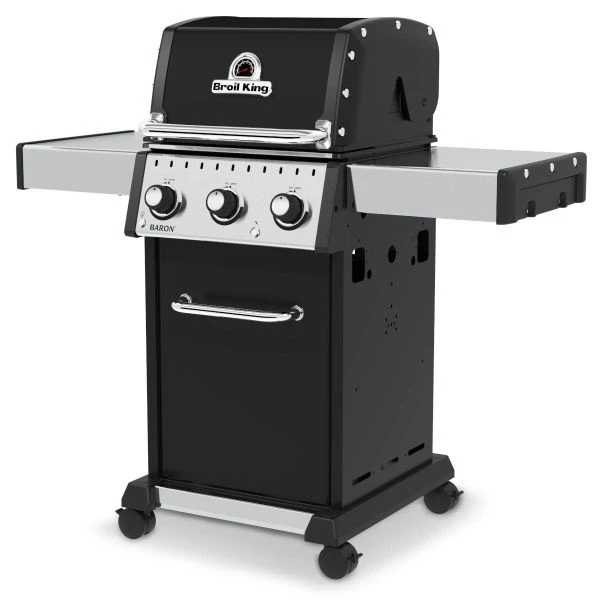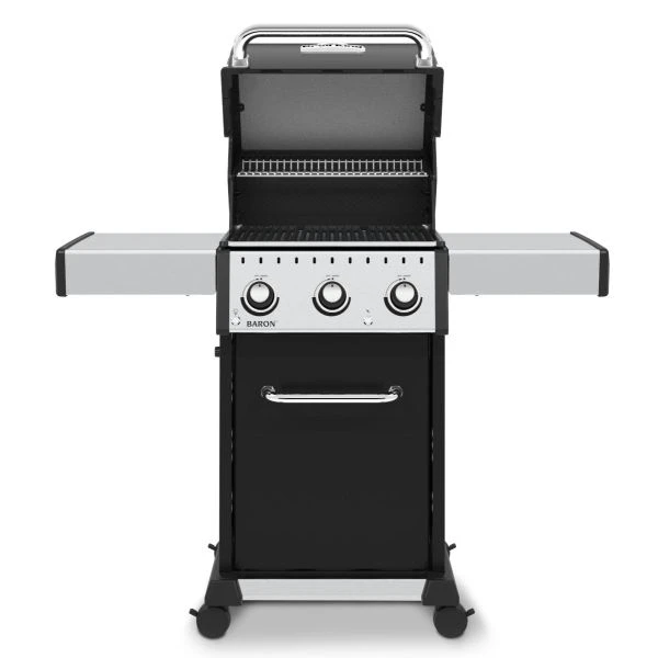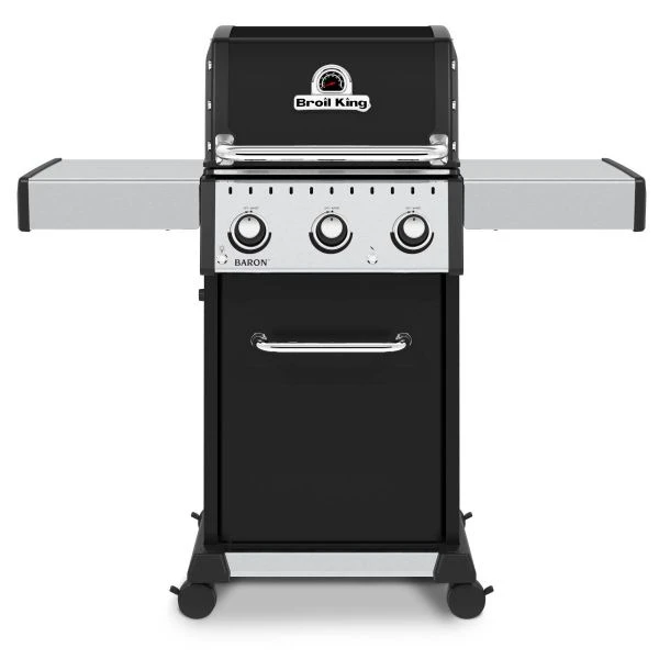 Der Broil King® Baron™ 320 verfügt über eine Gesamtgrillfläche von 2,984 cm² und beidseitig verwendbaren gusseisernen Gussgrillrosten, Warmhalterost, Flav-R-Wave™ Kochsystem aus Edelstahl und 3 Edelstahl Dual-Tube™-Brennern, abklappbaren Edelstahl-Seitenablagen einem geschlossenen Schrankunterteil.