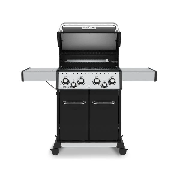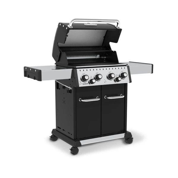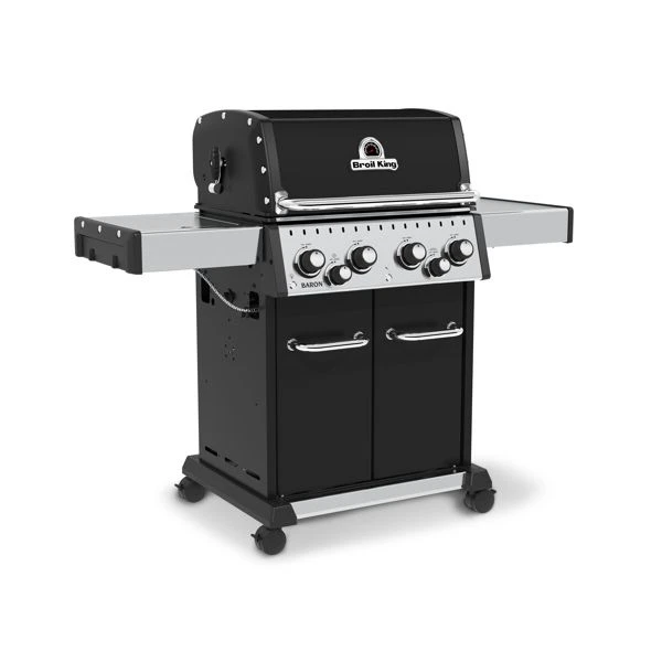 Der Baron™ 490 verfügt über massive Gussroste, dem Flav-R-Wave Verdampfersystem, 4 Edelstahl Dual-Tube™ Brenner, sowie klappbare Edelstahl Seitenablagen und einem geschlossenem schwarz lackierten Türen, sowie über einen schwarzen, doppelwandigen Deckel.