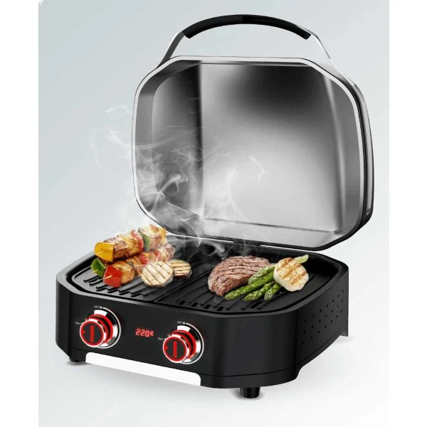 Elektrogrill mit hoher Hitze, effektiv und leicht zu reinigen. Hergestellt aus verzinktem Stahl, der anschließend lackiert wird. Steuertasten mit LED-Licht. Die Lichter werden weiß, wenn der Grill heizt, und wenn der Grill heiß wird, wechselt die Farbe zu rot. Digital geregelte Temperatur. Der Deckel ist verstellbar und kann in verschiedenen Graden geöffnet werden.