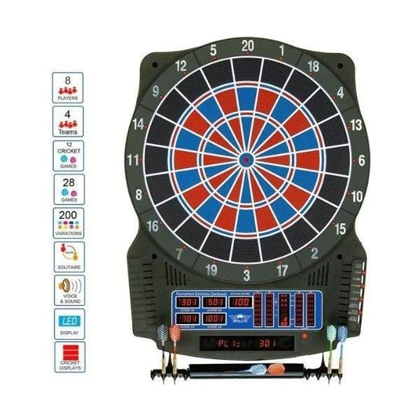 Bull’s Lightning, elektronische Dartscheibe mit Zweiloch Double und Triple Segmenten im Kabinett, mit Netztteil, LED Displays, 6 Darts und 12 Ersatzspitzen sind im Lieferumfang enthalten. Bis 8 Spieler, 28 Spiele,über 131 Varianten. Abprallerwertung (Bouncer), regulierbarer Klang und Sound-Effekt. Double In/Double Out Funktion. CyberMatches möglich. Ab 14 Jahren. NEU mit der unverwechselbaren Stimme des PDC- Callers Russ Bray