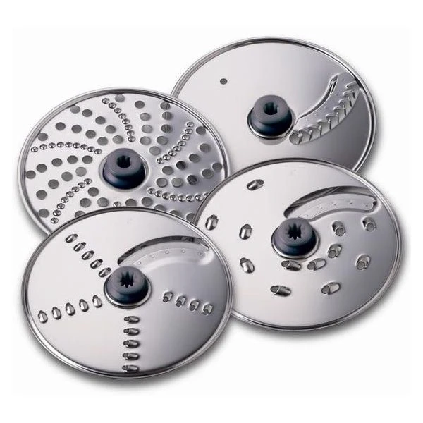 Inklusive 1,5 l Glas-Mixaufsatz, inklusive Entsafter, inkl. 1,5 l Arbeitsbehälter mit Edelstahlmesser und Metall-Handgriff + zusätzliche Mini-Arbeitsschüssel, inkl. 4 Arbeitsscheiben aus Edelstahl: grobe und feine Schneid- und Raspelscheibe, Kartoffelreibscheibe, Julienne-Scheibe, inkl. Wiegeplatte
