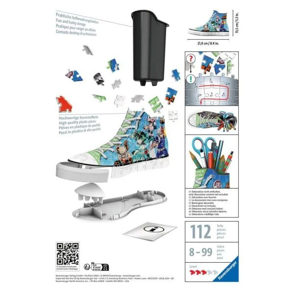 Mit diesem 3D Puzzle-Sneaker kannst du deinen Lieblings-Manga zu dir nach Hause holen! Der coole Sneaker im My Hero Academia Design ist nicht nur ein dekorativer Blickfang auf jedem Schreibtisch, sondern wieder auch reichlich Platz für alle Utensilien. Ein 3D Puzzle, das nicht nur Puzzlespaß bietet, sondern auch gute Dienste leistet: Denn die 108 nummerierten Kunststoff-Puzzleteile und die perfekt passenden Zubehörteile können zur praktischen Aufbewahrung genutzt werden – egal ob als Stiftebox, für Scheren oder anderen Krims-Krams. Dank der bebilderten Anleitung und den Zahlen auf der Rückseite der gewölbten Puzzleteile ist das Puzzeln des Organziers kinderleicht. Auch erwachsene My Hero Academia-Fans haben Ihre Freude am Puzzeln und ein großartiges Dekoobjekt mit reichlich Platz für Utensilien aller Art.