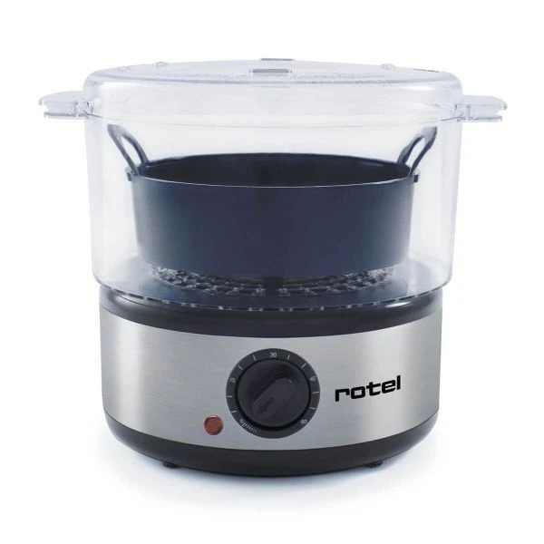 Dampfgarer aus Edelstahlgehäuse, Volumen: 2.4 Liter. Dampfgarer mit 1 Etage. 60 Minuten Zeitschaltuhr. Automatische Abschaltung bei aufgebrauchtem Wasser. Zubehör: Inkl. Reisschale. Alle beweglichen Teile spülmaschinenfest.