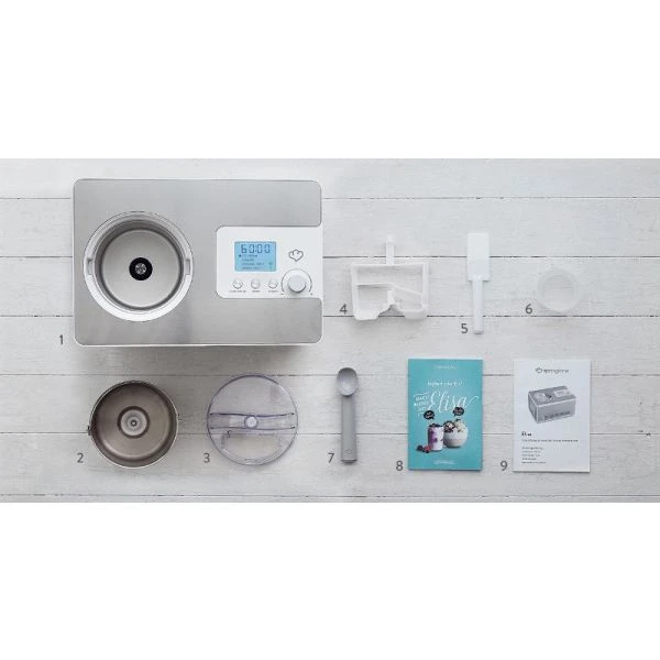 1. Eis- und Joghurtmaschine Elisa | 2. Edelstahl-Behälter | 3. Deckel mit Nachfüllklappe | 4. Rührteil | 5. Eisspatel | 6. Messbecher | 7. Eisportionierer | 8. Rezeptheft | 9. Bedienungsanleitung