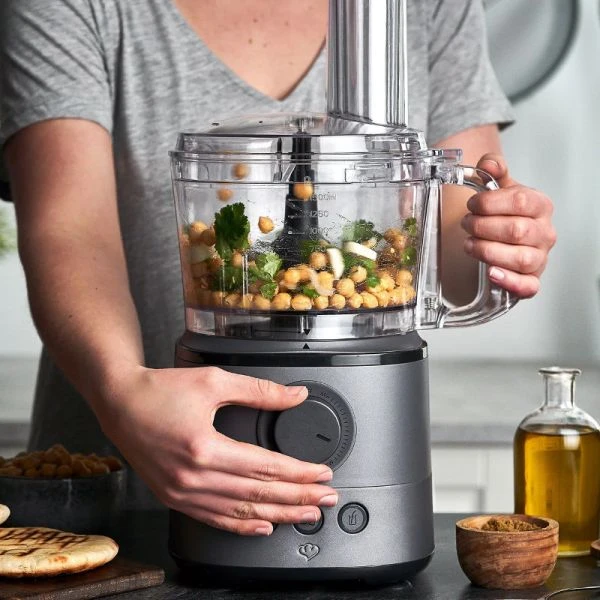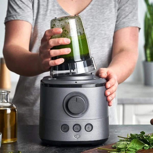 Kaias praktisches 3-in-1 System beinhaltet einen 1,5-Liter-Basisbehälter zum Zerkleinern, Schlagen und Kneten, einen Mixaufsatz für Smoothies sowie einen Mini-Zerkleinerer für Pestos & Co.