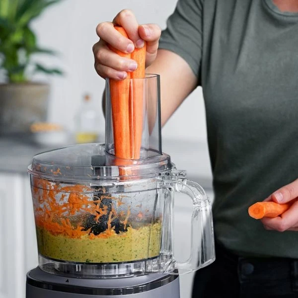 Kaias extra weiter Einfüllschacht ermöglicht es dir, die meisten Zutaten direkt am Stück in die Maschine zu geben. So sparst du Zeit, da kein vorheriges Zerkleinern nötig ist. Doch Kaia ist nicht nur dein Schnippel-Assistent. Sie mischt und knetet auch für dich.